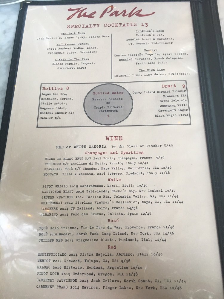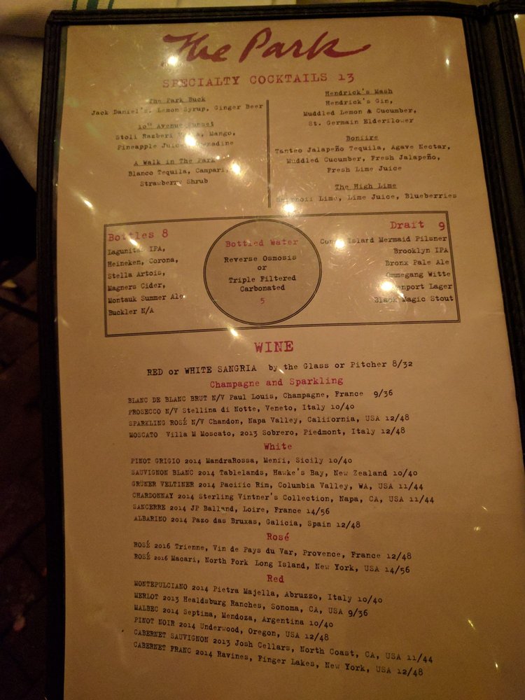 The Park is a trendy and classy venue located in New York City, offering a variety of delicious dishes and cocktails. With a rustic yet modern interior and outdoor seating, it provides a relaxing atmosphere for gatherings with friends or casual dates. The menu features options for vegan and vegetarian diners, as well as a full bar with tasty cocktails. Customer reviews praise the calamari, mozzarella pizza, and mushroom polenta with poached eggs for their flavorful taste. The portion sizes are slightly small but satisfying. The attentive service and cozy ambiance make it a go-to spot for meals and drinks. Whether you're looking for a laid-back brunch experience or a lively night out, The Park guarantees an enjoyable dining experience for all.